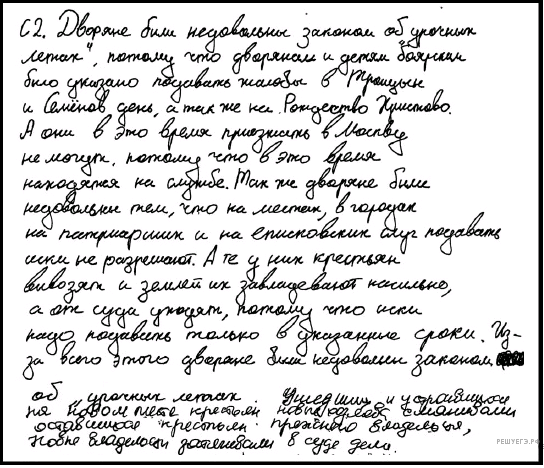 Да им же (дворянам и детям боярским) указано на патриарших и на епископских управителей и на монастыри в обидах подавать иски в суд на три сроки: на Троицын да на Семёнов день, да на рождество Христово, а им в те сроки в Москву приезжать невозможно, потому что они в то время находятся на службе. А на местах, в городах на патриарших и на епископских слуг подавать иски не разрешают, а те у них крестьян вывозят и землей их завладевают насильно и крестьянам их всякие обиды делают, а от суда уходят, потому что иски надо подавать только в указанные сроки».