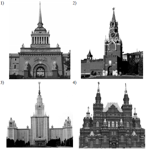 Какое из зданий, представленных ниже, было построено в годы руководства страной того же государственного деятеля, при котором была создана данная скульптура? В ответе запишите цифру, под которой оно указано.