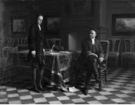 Какое из произведений живописи посвящено событию, произошедшему в том же десятилетии, когда был основан город, юбилею которого посвящена марка? В ответе запишите цифру, которой обозначено это произведение живописи. Укажите художника, создавшего данное произведение живописи.