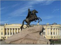 Укажите, какой памятник установлен в том же городе, что и ростральные колонны. Назовите монарха, при котором он был построен.