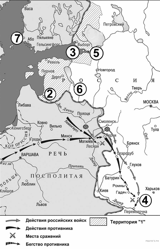 2) В битве, произошедшей вблизи обозначенного на схеме цифрой «4» города, неприятельские войска возглавлял король Стефан Баторий.