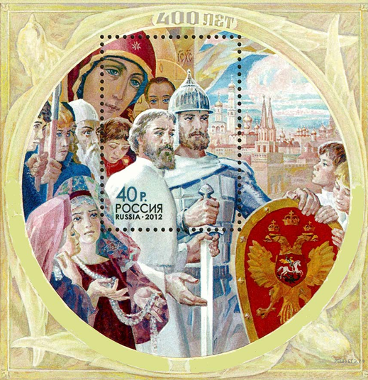 Напишите название периода в отечественной истории, событиям которого посвящён данный почтовый блок. Используя изображение, приведите одно любое обоснование Вашего ответа.