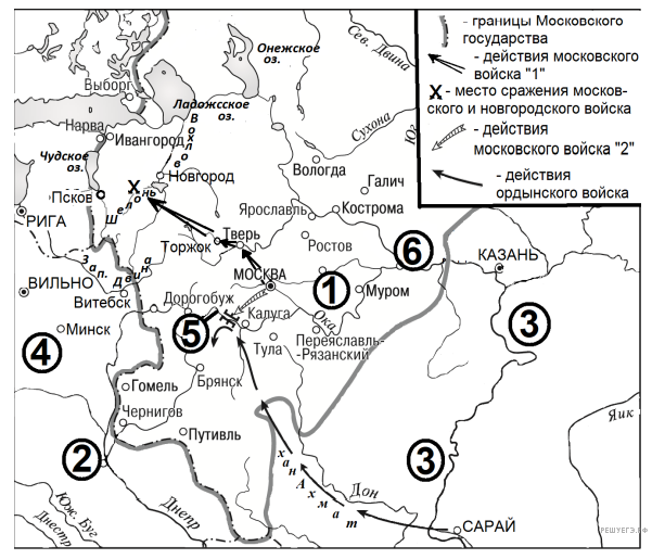«В наступившей войне по замыслу великого князя русские войска должны были действовать на трёх направлениях: северо-западном, западном и юго- западном. В начале мая из Москвы вышли войска под командованием Якова Захарьевича Кошкина, которые должны были действовать на последнем из направлений. Войска легко овладели Серпейском, Мценском и Брянском, князья которых признали власть Москвы. От Брянска войско Кошкина пошло к стоявшему на реке Сейм _______________, а от него — к Гомелю».