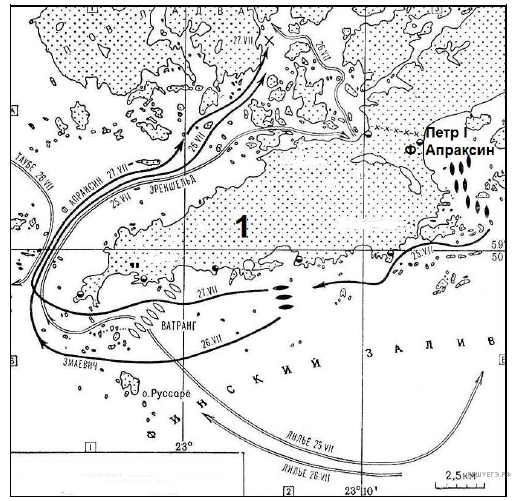 «Морская битва состоялась в 1714 году на Финском заливе. В ней шведский флот потерпел сокрушительное поражение от молодого балтийского флота под командованием генерал-адмирала графа ____________».
