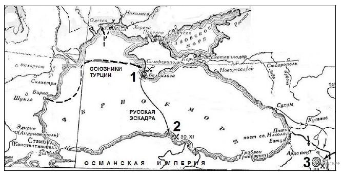 «Поражение турок в Синопе ускорило вступление в войну Англии и Франции. 22 декабря соединенный англо-французский флот вошел в __________ море. Через три дня английский пароход «Ретрибюшен» подошел к [русскому порту] и объявил командиру порта, что для предотвращения войны с Англией и Францией русский флот не должен выходить из гавани и нападать на турецкий флот».