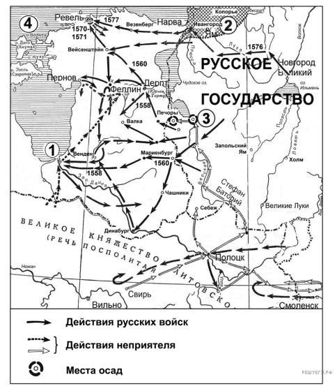 «Русские войска были разбиты под Венденом 21 октября 1578 г. Сапегой и Бойэ. Русские потеряли Полоцк (1579), Сокол, Велиж, Усвят, Великие Луки. Польские и литовские отряды разоряли Смоленщину, Северскую землю, Рязанщину, юго-запад Новгородчины, грабили русские земли вплоть до верховьев Волги. Произведённые ими опустошения напоминали худшие татарские набеги. Литовский воевода Филон Кмита из Орши сжёг в западных русских землях 2000 сел и захватил огромный полон. Литовские магнаты Острожские и Вишневецкие с помощью лёгких конных отрядов разграбили Черниговщину. Конница шляхтича Яна Соломерецкого разорила окрестности Ярославля. Самым дальним северо-восточным населённым пунктом, который сожгли литовцы, стал город _____________».
