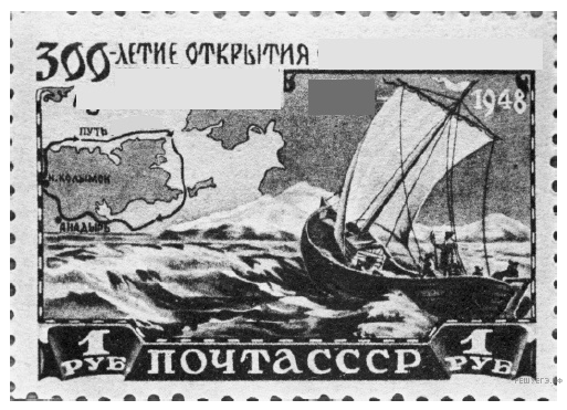 Какая историческая сцена изображена в левой части марки? Используя изображение, приведите одно любое обоснование Вашего ответа.