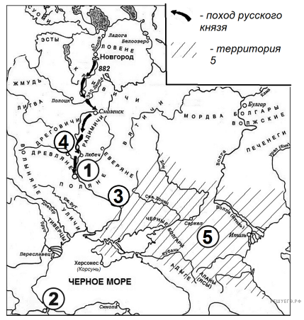 Укажите имя князя, походы которого обозначены в легенде схемы цифрой 1.