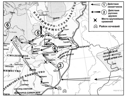 Заполните пропуск в предложении: «Поход, обозначенный в легенде схемы цифрой 6, возглавил хан ______________».