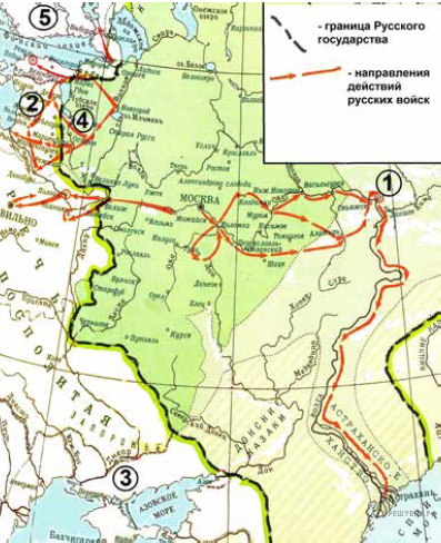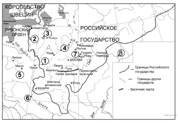 Укажите век, когда в состав единого Русского государства вошли города, обозначенные на схеме цифрами 3, 4 и 5 (ответ напишите словом).
