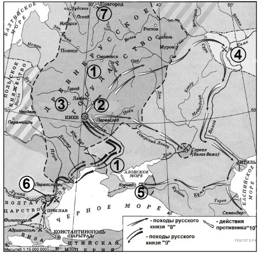 Назовите имя киевского князя, походы которого обозначены на схеме цифрой 6.