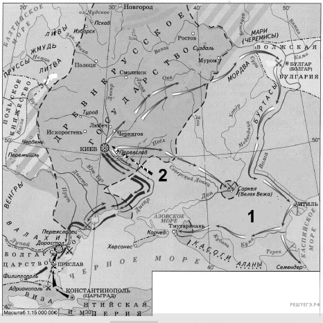 Укажите имя князя, походы которого обозначены в легенде схемы цифрой 1. Имя правителя указывается с отчеством (например, Александр Павлович).